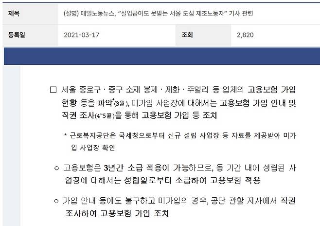 | ▲ 고용노동부 보도설명자료 지난 2021년, 주얼리 업체들이 4대보험에 미가입된 현실을 지적하는 언론보도에 대하여, 고용노동부는 "미가입 사업장을 직권조사하여 고용보험 가입 조치하겠다"는 내용으로 보도설명자료를 발행했다. |