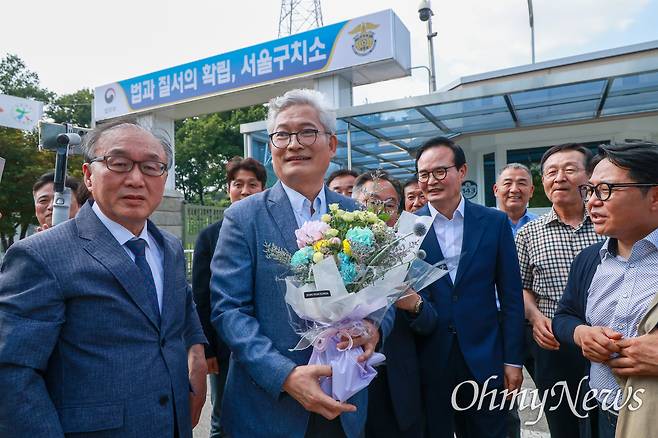 불법 정치자금 수수 혐의로 1심에서 실형을 선고받고 법정구속 된 소나무당 송영길 대표가 23일 오후 경기도 의왕시 서울구치소에서 보석으로 석방되고 있다.