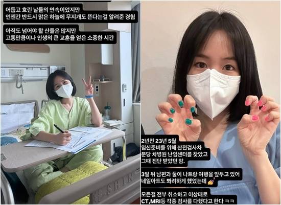 그는 "3일 뒤 남편과 나트랑 여행 앞두고 있어 네일아트도 화려하게 했었는데 모든 걸 전부 취소하고 이 상태로 각종 검사를 다했다고 한다. 매일 꿈이길 바라며 눈물만 흘렸던 시절"이라고 적었다.
