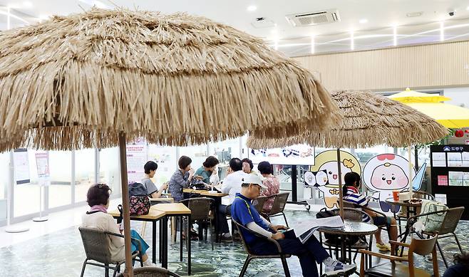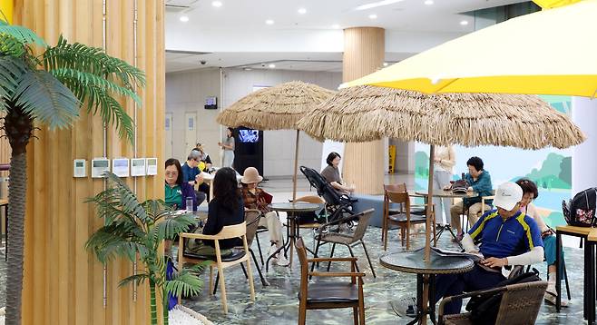 23일 서울 도봉구 방학동 도봉구청을 찾은 구민들이 파라솔과 테이블이 배치된 휴양지 콘셉트의 무더위쉼터에서 휴식을 취하고 있다.