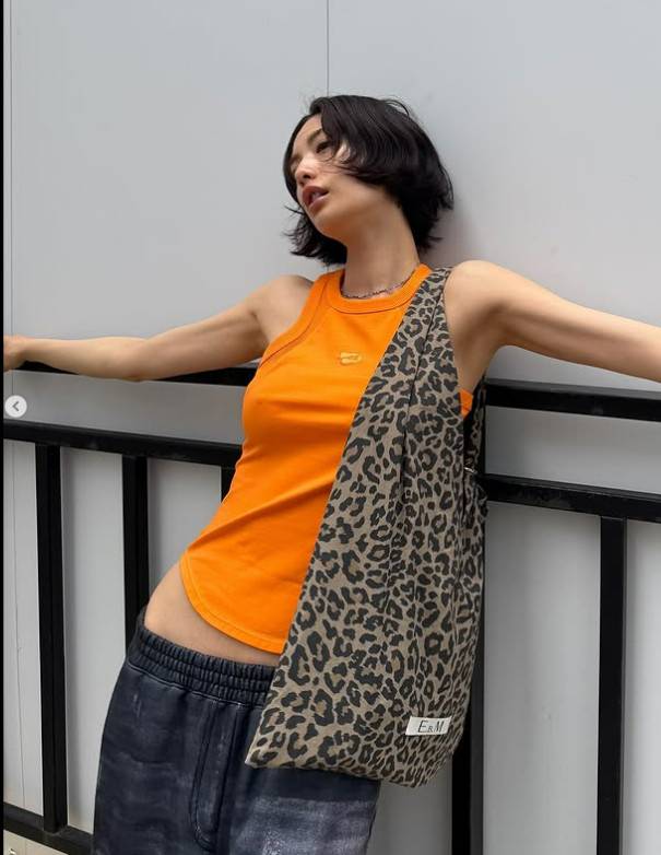 상의는 속옷을 입지 않고 오렌지 컬러 민소매 티셔츠만 입은 채 자유로운 느낌을 자아낸 나나는 와이드핏 데님 바지에 호피무늬 백으로 스타일링에 포인트를 더했다.