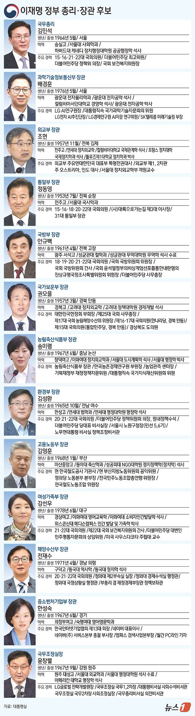 (서울=뉴스1) 김초희 디자이너 = 이재명 대통령이 23일 첫 장관 인선을 단행했다. 전문성이 필요한 분야에는 기업인 출신을 발탁하는 등 '유능함'을 우선시 하는 이 대통령의 인사 철학을 반영했다는 평가다. 강훈식 대통령실 비서실장은 이날 오후 용산 대통령실에서 브리핑을 통해 11개 부처 장관 후보자와 신임 국무조정실장 인사를 발표했다. 후보자 명단은 ▲과학기술정보통신부 배경훈 ▲외교부 조현 ▲통일부 정동영 ▲국방부 안규백 ▲국가보훈부 권오을 ▲농림축산식품부 송미령 ▲환경부 김성환 ▲고용노동부 김영훈 ▲여성가족부 강선우 ▲해양수산부 전재수 ▲중소벤처기업부 한성숙 등이다.