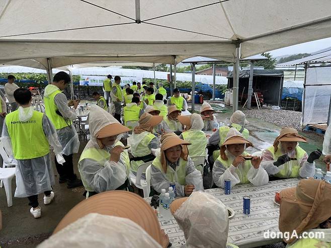 잠시 작업을 멈춘 오전 11시 무렵, 간이 천막 아래로 사람들이 하나둘 모였다. 큰 대야에 담긴 탐스러운 수박이 잘게 잘려 테이블 위에 놓였다. 비를 피해 모여든 농협 직원들은 아침 일찍부터 이어진 봉사활동의 피로를 달콤한 수박 한 입으로 달랬다. 사람들의 옷에는 땀과 빗물이 뒤섞여 흘렀지만 그 속에선 ‘함께하는 뿌듯함’이 배어 있었다. 행사는 오후 4시가 돼서야 끝이 났다. 각자 밀린 업무를 뒤로한 채 이날만큼은 온종일 진흙투성이의 성실한 일꾼으로 하루를 보냈다.