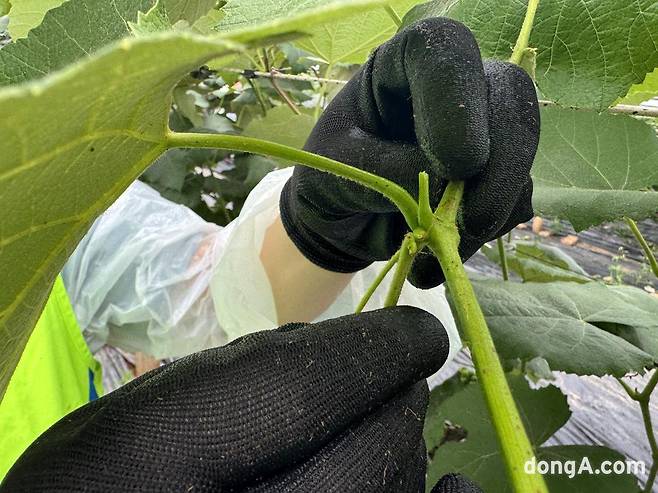 실제로 이 기간 포도 농가는 눈코 뜰 새 없다. 순치기와 알 솎기만 해도 한나절인데 온전한 포도송이에 봉지 씌우기까지 병행해야한다. 이날 취재진도 포도 농가에 상주하는 관리자와 숙달된 농협 직원들의 도움을 받아 일손을 보탰다.