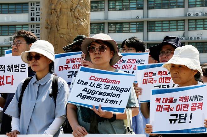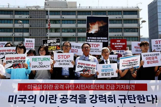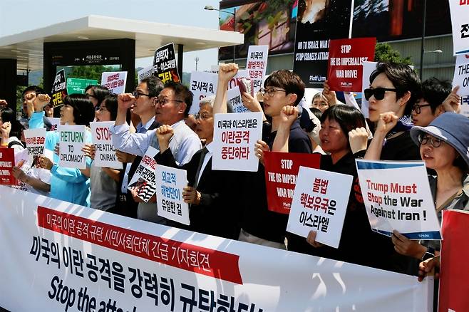 | ▲ 시민사회단체 회원들이 이란의 핵시설을 선제 공격한 미국 트럼프 대통령을 규탄하고 있다. |