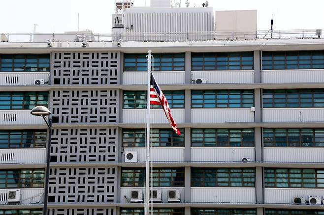 | ▲ 시민사회단체들의 미국 규탄 기자회견이 열린 광화문 주한 미국대사관에 걸린 성조기가 바람에 펄럭이고 있다. |
