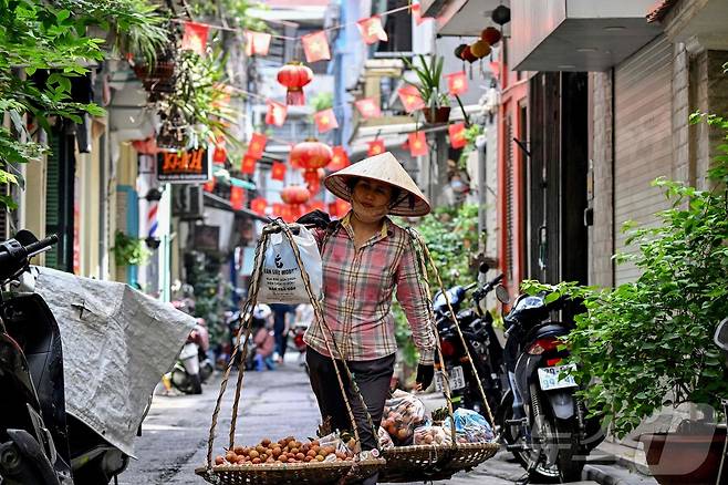 (하노이 AFP=뉴스1) 권영미 기자 = 베트남 하노이의 올트쿼터에서 한 상인이 열대과일인 리치를 팔고 있다. 2025.06.23.