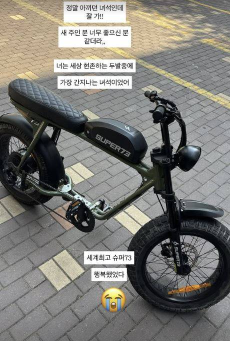 일명 '자토바이'로 불리는 해당 자전거는 전기 자전거 브랜드 슈퍼73의 모델로, 그는 "3년 전에 돈 없던 아내가 12개월 할부로 사준 생일선물이었다"고 설명했다.