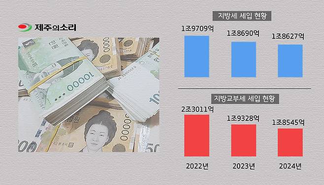 지방교부세는 지자체 간 재정력 격차를 해소하기 위해 국세 중 일정액을 지원하는 예산이다. 제주는 2022년 2조2997억원에서 2023년 1조9309억원, 2024년 1조8534억원으로 줄었다.