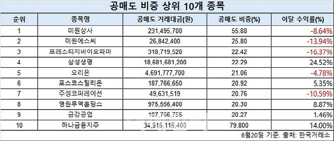 이 밖에도 바이오 기업인 프레스티지바이오파마(22.4%), 보험업종 대형주인 삼성생명(22.3%), 식품 업종의 오리온(21.6%), 철강주 포스코스틸리온(20.9%) 등 다양한 업종에서 공매도 상위 종목이 등장했다. 특정 섹터에 한정되지 않고 전방위적인 매도세가 나타나는 모습이다.
