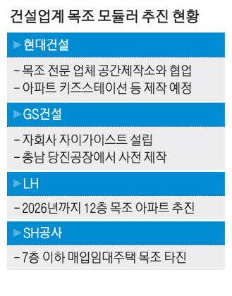 공공 분야 목조 모듈러도 늘어날 전망이다. 서울주택도시공사(SH공사)는 올해 4월부터 중저층 목구조 공동주택 실현 가능성에 대한 연구 과제에 착수했다. 연내 기술 적용 여부를 판단하기 위한 기초 연구다. 7층 이하 저층 매입임대주택 등 소규모 공공 주택에서의 활용 가능성을 타진하고 있다. 한국토지주택공사(LH)는 지난해부터 2026년까지 3년간 연구를 통해 최대 12층 규모 목조 아파트 단지 조성을 추진하고 있다.