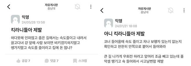 | ▲ 충남대 온라인 커뮤니티에 올라온 전동 킥보드에 대한 불만을 토로하는 모습 |
