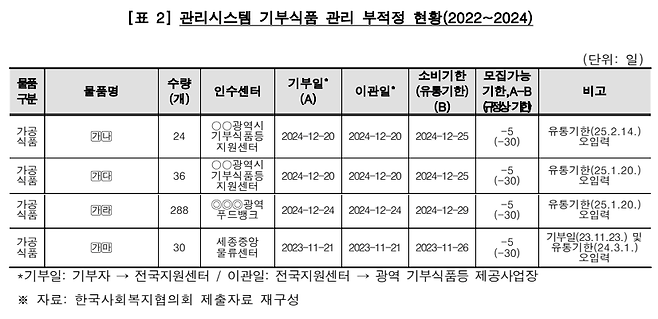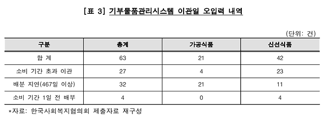 이같은 관리시스템 오입력으로 인해 ▲소비기한을 초과해 이관 처리(27건) ▲소비기한을 하루 남기고 이관(4건) ▲기부일자로부터 최소 467일 및 최대 1천275일 지나서 이관(32건)한 것으로 드러났습니다.