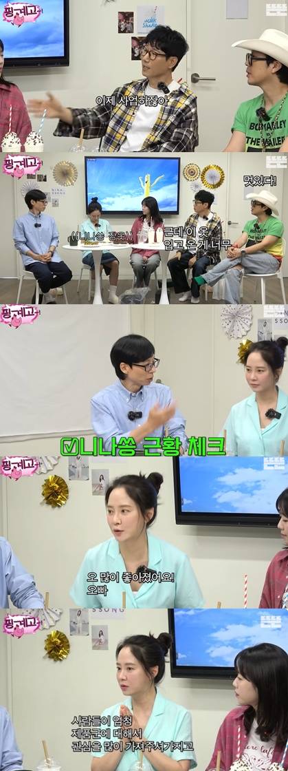 이날 송지효는 자사 브랜드의 잠옷을 직접 착용한 채 등장했다. 최근 판매 수익이 이전보다 나아졌느냐는 질문에 그는 "많이 좋아졌다"고 긍정적으로 답했다.