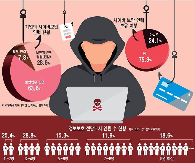 공공기관도 마찬가지다. 국가정보원이 이달 발간한 '2025 국가정보보호백서'를 보면, 기관 10곳 중 7곳(67.1%)만이 정보보호 전담부서를 운영하고 있다. 이마저도 정보보호 전담부서 인력이 4명 이하인 곳이 절반 이상(54.23%)을 차지할 만큼 대응 인력이 부족하다. 실제 정보보호 전담조직을 운영하는 기관이 희망하는 정보보호 전담인력 규모는 '9명 이상'이 39%에 이를 정도로 현실과 큰 괴리가 있는 것으로 드러났다.