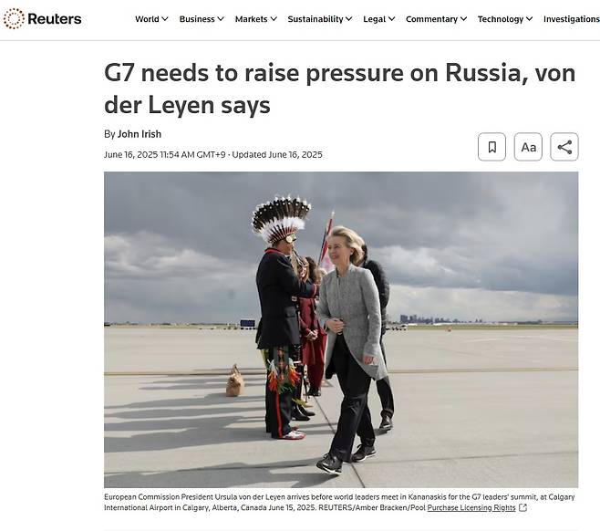 | ▲ 16일, 로이터가 캐나다에서 개최된 G7 정상회의에서 폰 데러 라이엔이 한 발언을 보도하고 있다. |
