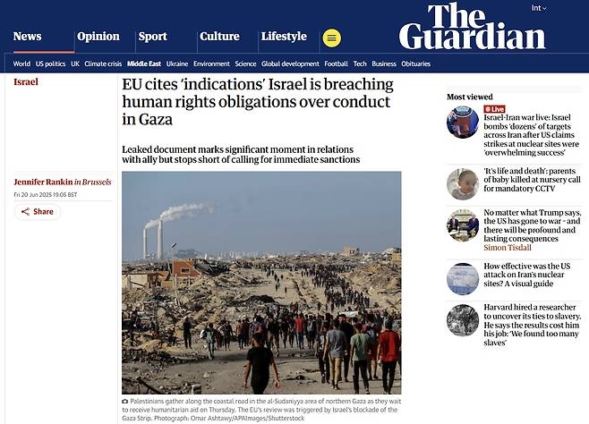 | ▲ 20일, 영국의 가디언지는 유럽연합이 내부적으로 이스라엘의 가자지구 공습과 관련해 인권 침해를 확인했다는 공식 문서를 입수했다고 보도했다. |