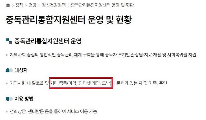 | ▲ 보건복지부 홈페이지에서 확인해 본 결과 보건복지부가 인터넷 게임을 알코올과 마약, 도박과 함께 중독으로 명기하고 있음을 확인할 수 있다. |