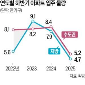 지방은 하반기 4만7495가구가 준공할 예정이다. 상반기(8만215가구)보다 41% 적다. 대구(7467가구)와 충북(7063가구)이 입주 물량이 많은 편이다. 충남(5430가구)과 전북(4838가구), 경북(4647가구), 강원(4606가구) 등도 4000가구를 웃돈다.