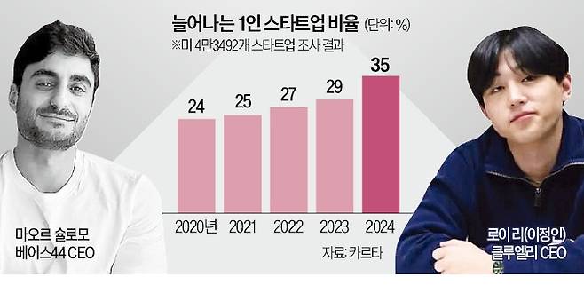 23일 테크업계에 따르면 최근 1인 창업은 스타트업 업계에서 익숙한 형태로 자리 잡고 있다. 스타트업 지원 플랫폼 기업인 카르타에 따르면 2015년 미국 전체 스타트업의 17%에 불과한 1인 스타트업 비율은 지난해 35%로 두 배 이상 늘었다. 다리오 아모데이 앤스로픽 최고경영자(CEO)는 지난달 한 개발자 콘퍼런스에서 “내년이면 1인 기업이 AI를 활용해 10억달러 규모로 성장할 수 있게 될 것”이라고 말했다.