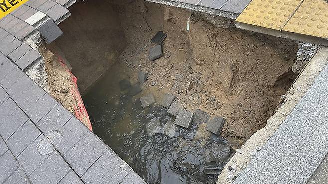 시는 추가 침하를 막기 위해 낡은 관로를 교체하고 토사를 메운 뒤 부직포로 덮어 임시 조치한 상태입니다.