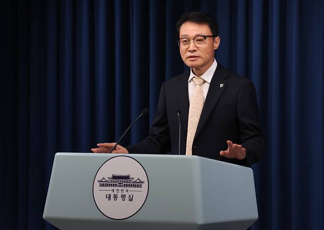 [이규연 홍보소통수석이 23일 용산 대통령실에서 대통령 주재 수석보좌관회의 관련 브리핑을 하고 있다. (사진=연합뉴스)]