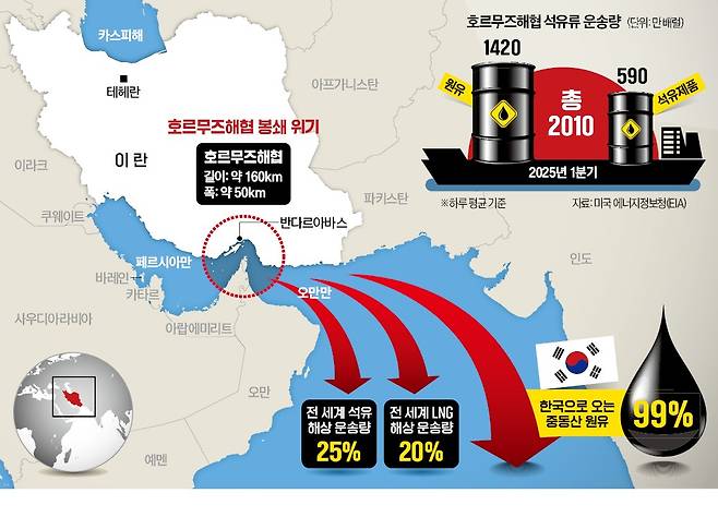 이 해협을 통과하는 원유는 대부분 한국을 포함해 중국 일본 인도 등 아시아 시장을 향한다. KOTRA는 최근 보고서에서 한국으로 오는 중동산 원유의 99%가 이 해협을 거친다고 분석했다. 이런 호르무즈해협의 지정학적 중요성 때문에 해협 봉쇄는 이란이 미국과 이스라엘을 위협할 회심의 반격 카드로 꼽힌다.