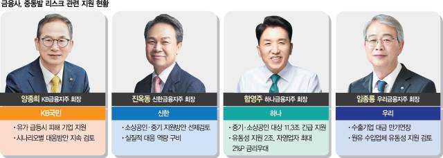 전날 임종룡 우리금융지주 회장 주재로 ‘중동 상황 관련 긴급 점검 회의’를 개최한 우리금융은 이날 기업 담당자를 통해 거래 기업 상황 파악에 나섰다. 앞서 임 회장은 그룹의 유동성과 자산 건전성, 자본 비율을 수시로 점검하고 일시적으로 자금 애로를 겪는 수출·내수 기업에 대한 긴급 지원을 지시했다. 수출 대금 만기 연장 같은 유연한 금융 지원 방안을 추진하라고도 했다.