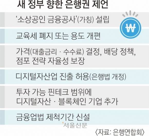국내 은행들이 이재명 정부에 ‘소상공인 금융공사’(가칭) 설립을 제안하고 나섰다. 원화 스테이블코인 발행 등 디지털자산업 진출을 허용해달라고도 요청했다.