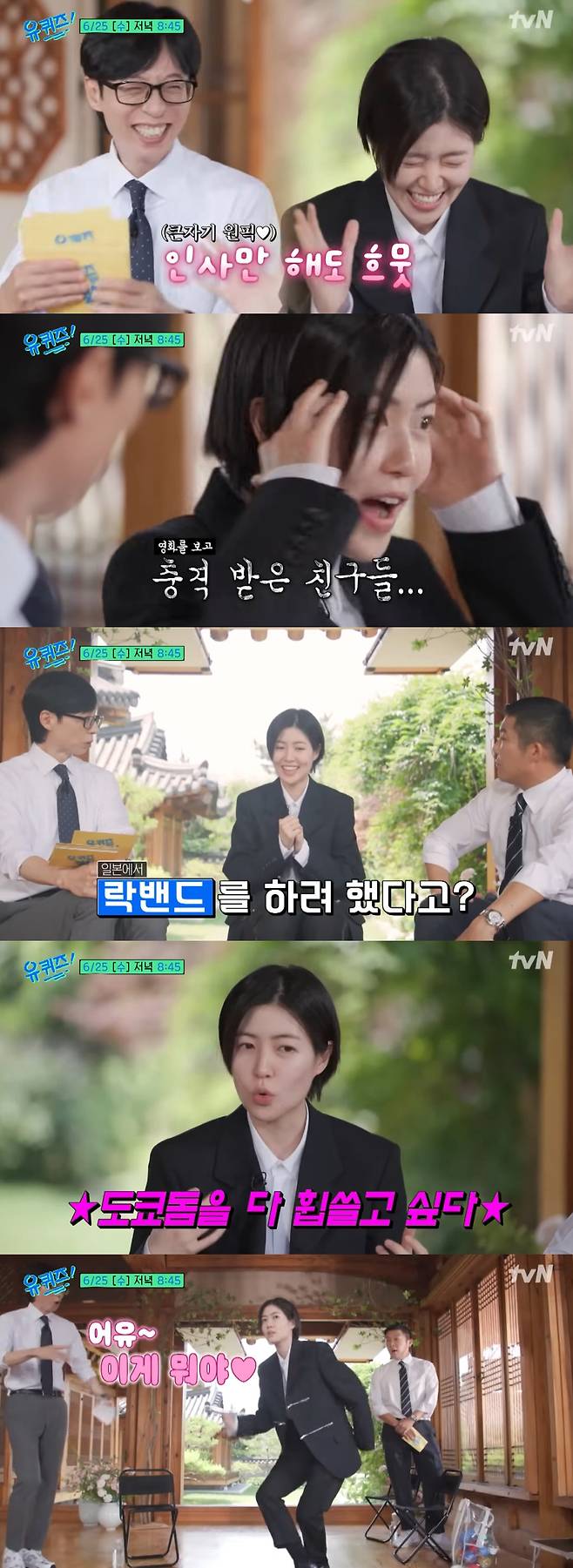 23일 tvN '유 퀴즈 온 더 블럭'은 "큰 자기 재석의 웃음 버튼. 보기만 해도 흐뭇한 배우 심은경이 옵니다! 영화 '써니' 촬영 후 미국 유학길에 오른 은경! 배우 은경의 영화를 보고 친구들이 연신 OH MY GOD을 외친 사연은? 일본에서 밴드를 결성해서 도쿄돔을 휩쓸고(?) 싶은 은경의 방구석 콘서트 썰과 엣지 있는 댄스까지!"라는 글과 함께 영상을 게재했다.