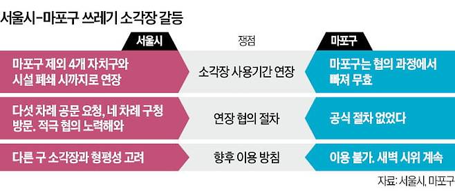 이번 사태는 서울시가 지난달 16일 마포구를 제외한 4개 자치구와 마포자원회수시설 공동이용 기간을 시설 폐쇄 시까지 연장하면서 촉발됐다. 협약은 ‘시설 사용개시일부터 20년’이던 사용 기간을 ‘시설 폐쇄 시까지’로 무기한 연장하는 내용을 담고 있다. 서울시는 “다섯 차례 공문을 보내고 여러 번 대면 협의를 거쳤다”고 밝혔으나 마포구는 “일방적인 결정”이라고 맞서고 있다.