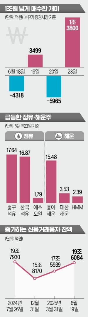 국내 증시가 올 들어 크게 오르는 동안 극심한 포모(FOMO·소외 공포증)에 시달린 ‘서학개미’(미국 증시에 투자하는 개인투자자)들은 중동 분쟁에 따른 조정을 되레 매수 기회로 삼는 분위기다. 이달 초만 해도 국내 주식을 던지던 개인들은 빠르게 태세를 전환하고 있다. 6월 첫째 주(3거래일) 유가증권시장에서 2조2030억원어치를 팔아치운 개인은 둘째 주 4582억원, 셋째 주엔 925억원으로 순매도 규모를 줄였다.