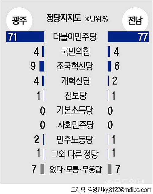 광주를 기준으로 한 정당 지지도의 경우 민주당에 이어 조국혁신당이 9%로 그 뒤를 이었으며 국민의힘·개혁신당 4%, 민주노동당 2%, 진보당과 그 외 다른 정당 1% 등 순이었다. 지지하는 정당이 없거나 모름, 무응답을 선택한 부동층은 7%였다.