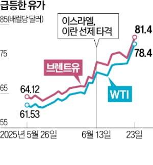 브렌트유 선물 가격은 23일 개장 직후 5.7% 급등한 배럴당 81.4달러로 치솟았다. 브렌트유 가격이 80달러를 넘어선 것은 지난해 7월 이후 처음이다. 이날 서부텍사스원유(WTI) 선물도 장 초반 6% 넘게 올라 배럴당 78.4달러를 기록했다. 이란이 호르무즈해협을 봉쇄할 가능성이 높지 않다는 관측이 퍼지자 브렌트유는 80달러 밑으로 내려왔고 WTI 상승폭도 축소됐다. 브렌트유와 WTI 가격은 지난 13일 이스라엘의 이란 공습 이후 약 12~13% 상승했다.