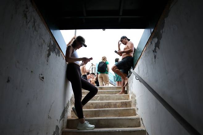 [23일(현지시간) 오전 이스라엘 텔아비브 해변의 한 방공호 입구에 시민들이 모여 있다. (텔아비브 EPA=연합뉴스)]