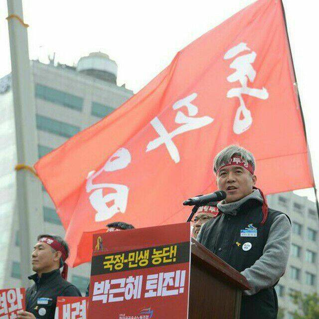| ▲ 총파업 출정하는 김영훈 2017년 4월 16일 박근혜퇴진 총파업 출정식에서 김영훈 당시 위원장이 발언하는 모습이다. 김영훈 페이스북 갈무리 |