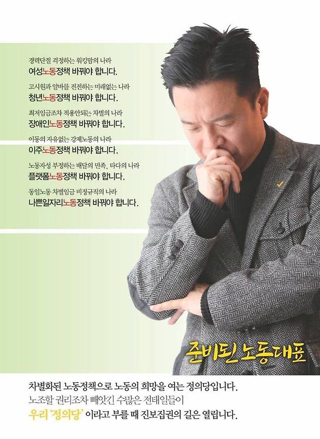 | ▲ 준비된 노동대표 김영훈 장관 후보자는 2020년 2월 21일 정의당 비례대표로 총선에 임하며 준비된 노동대표임을 홈보 포스터에 녹여냈다. 김영훈 페이스북 갈무리 |