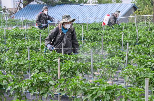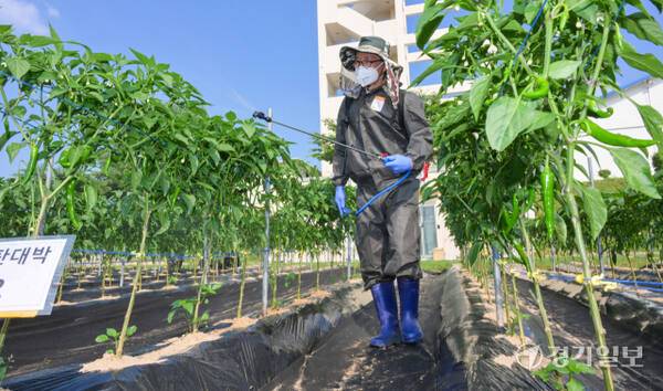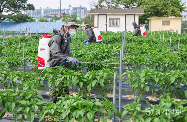 23일 화성특례시 경기도농업기술원 연구용 고추밭에서 관계자들이 탄저병 예방을 위한 방제작업을 하고 있다. 도농업기술원은 최근 기온 상승과 잦은 호우로 고추, 사과 등 작물에서 탄저병 발생이 우려된다며 농가에 사전 방제를 당부했다.