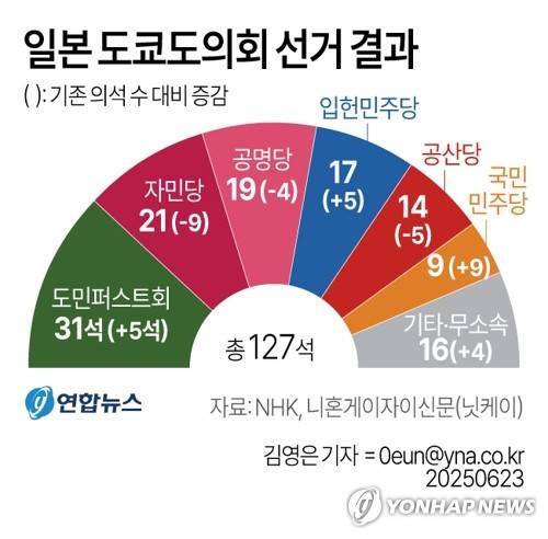 23일 NHK와 니혼게이자이신문(닛케이) 등 일본 언론에 따르면 전날 투표가 이뤄진 도쿄도 의회 선거에서 자민당은 전체 127석 가운데 21석을 얻었다.