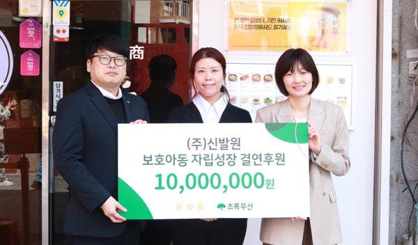 ㈜신발원(대표이사 수의덕)은 초록우산(부울경권역총괄본부장 이수경)을 통해 아동양육시설에서 생활하고 있는 보호아동의 자립성장을 위해 1000만 원을 후원(사진) 했다.