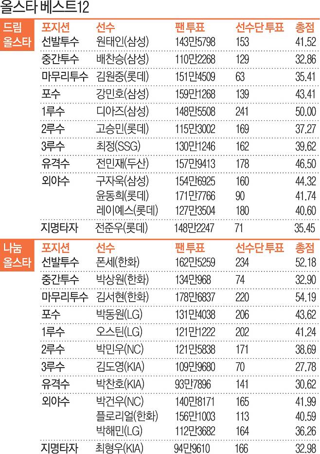 올해 올스타 베스트12 투표에서는 롯데와 삼성의 강세가 두드러졌다. 드림 올스타에서는 롯데가 6명, 삼성이 5명 등이 리스트에 이름을 올렸다. 나눔 올스타에서는 한화가 4명, KIA와 LG가 각각 3명씩 배출했다. 올스타전 데뷔전을 치르는 선수들도 적지 않다. 드림 올스타에서는 배찬승, 디아즈, 고승민, 전민재, 레이예스가 첫 올스타전 무대에 오른다. 나눔 올스타에서는 폰세, 김서현, 플로리얼이 ‘별들의 잔치’ 초대장을 받았다.
