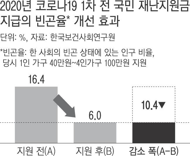 과거 연구 결과를 보면, 전 국민 지원금은 빈곤·불평등 완화에 확실한 효과를 보인 것으로 나타났다. 보건사회연구원이 2021년 발간한 보고서를 보면, 문재인 정부가 1차 전 국민 재난지원금을 지급하기 전 빈곤율은 16.4%였으나 재난지원금 지급 후 6%로 10.4%포인트 급감했다. 같은 해 9월 실시된 2차 재난지원금의 ‘핀셋’ 지원도 특수고용직 노동자의 빈곤율은 최대 14.9%포인트, 자영업자의 빈곤율은 6.3%포인트 하락했다.