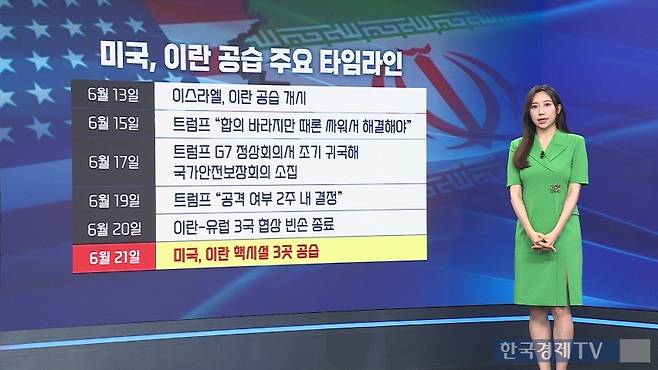한편, 이날 방송에서 박정언 한국경제TV 캐스터는 "미국이 스텔스 폭격기와 벙커버스터를 동원해서 이란의 핵심 핵 시설 세 곳을 폭격했다"며 "당초 2주 안에 공격 여부를 결정하겠다고 제시했지만 데드라인을 훨씬 앞당겨 중동 분쟁에 직접 개입했다"고 언급했다. ● 핵심 포인트 - 미국이 이란의 핵시설을 공격해 중동의 불확실성이 커짐 - 중동 사태의 해결은 이스라엘의 추가 공격 여부, 이란의 보복 수준, 주변 아랍 국가의 개입 여부에 따라 달라질 것으로 전망 - 중장기적으로는 이란의 핵 개발로 인한 위협이 증가할 것으로 예상됨 - 전쟁 발생 시 단기적으로 유가 변동성이 확대되더라도 사태가 조기에 수습된다면 환율 영향은 제한적일 것으로 예상 - 장기화되어 전 세계적으로 물가 상승 및 불안 심리가 지속될 경우 원·달러 환율에 큰 부담으로 작용할 가능성이 있음