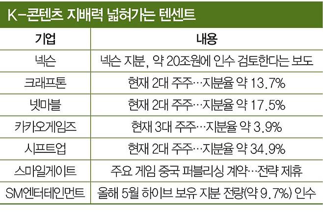 넥슨뿐 아니다. 텐센트는 수년 전부터 야금야금 국내 게임·콘텐츠 생태계 전반에 영향력을 키워오는 중이다. 3N(넥슨·엔씨소프트·넷마블)과 2K(크래프톤·카카오게임즈)로 대표되는 한국 주요 게임 기업 중 3곳은 이미 텐센트가 2~3대 주주로 있다.