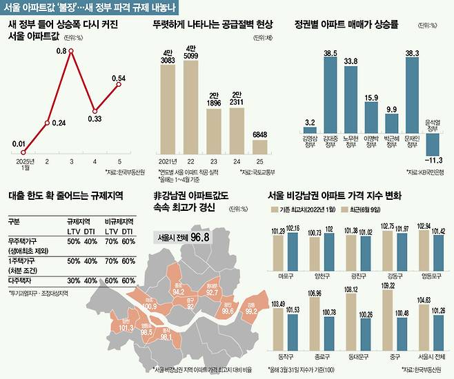 이제 막 취임한 이재명정부는 대책 마련에 부심한 모습이다. 주택 공급 위주 정책을 펴겠다고 공언했지만 당장 급한 불을 끄기 위해 대출, 세금 규제 등 가용한 카드를 모두 동원해야 할 처지다. 정부는 과연 서울 아파트값 상승세를 잡을 수 있을까.