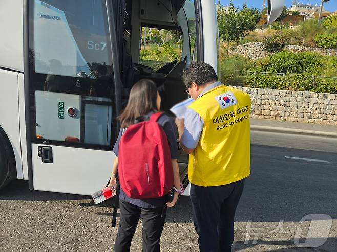 (서울=뉴스1) = 이스라엘에 체류하던 대한민국 국민 44명과 미국 국적 재외동포 1명이 23일(현지시간) 이집트에 무사히 도착했다.