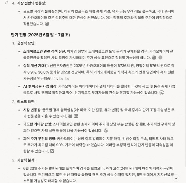 스테이블코인 관련 정책 진전: 이재명 정부의 스테이블코인 도입 논의가 구체화될 경우, 카카오페이의 선불충전금을 활용한 사업 확장이 가시화되며 주가 상승 요인으로 작용할 가능성이 큽니다.