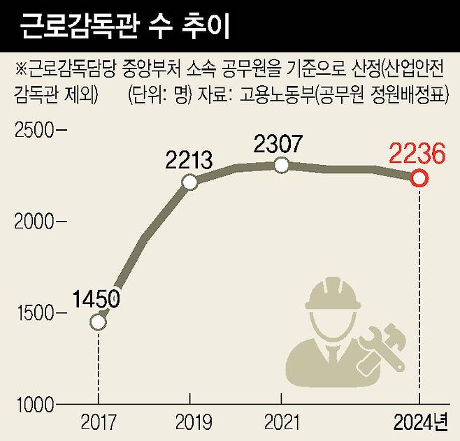 근로감독관은 앞서 문재인 정부 시절에도 1천명 남짓 늘어나 지난해 말 기준으로 근로기준·산업안전 분야에 3131명 수준이다. 노동부는 2028년까지 노동부 소속으로 4천명, 지방정부 소속으로 3천명을 증원하겠다는 계획을 국정기획위에 보고했다. 노동부는 구체적인 증원 수 등을 놓고 행정안전부와 협의 중인 것으로 알려졌다. 노동부는 계획대로 증원하는 데 들어가는 추가 예산을 2조~3조원으로 추산하고 있다.