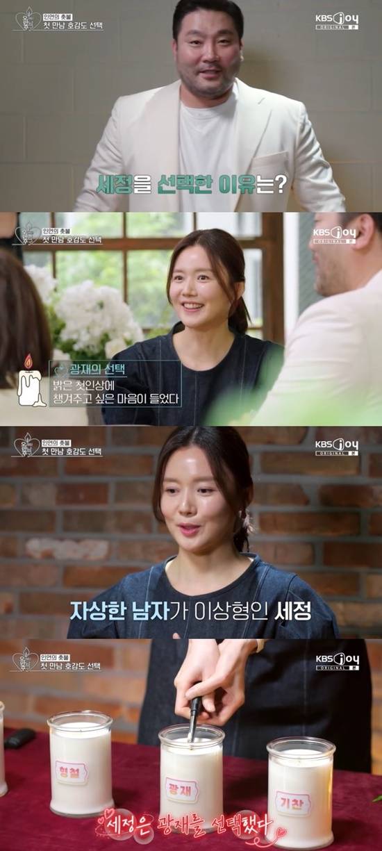이어 "저는 기본적인 이상형이 자상한 사람이다. 함께 있던 중에 그 분에게서 이 모습을 유일하게 발견했다. 그래서 이 분을 선택하려고 한다"면서 박광재의 이름이 적힌 촛불에 불을 밝혔다.