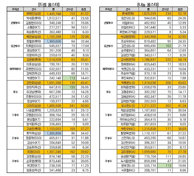 이 외에도 두산 포수 양의지(155표)는 드림 올스타 포수 부문 선수단 투표에서 강민호(삼성·139표)에 근소하게 앞섰으나, 팬 투표에서 94만 표 이상의 열세를 만회하기에는 역부족이었다.